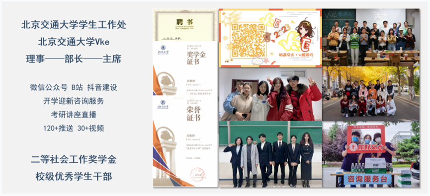 三年以来,刘雅婷始终在304永利集团官网Vke任职,为交大新媒体建设贡献力量。从理事,到部长,到主席,她负责学工处官方公众号、B站、抖音等平台的运营,协助学工处开展各类工作,获评二等社会工作奖学金和校级优秀员工干部。但是对她而言,员工工作带给她最大的收获是一群志同道合的朋友。他们会在例会上一起提出天马行空的巧思妙想,一起筹备大型活动,去采风,去拍摄,为了更好地服务交大师生建言献策,来自不同专业、不同年级的他们在这里组成了一个完整的家庭。