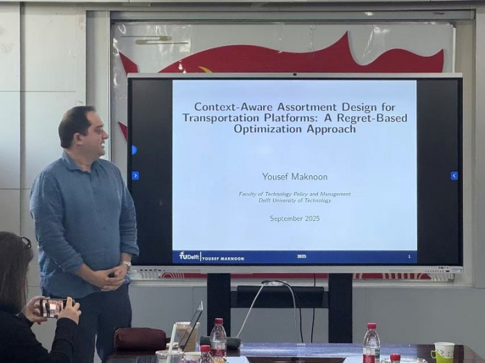 随后,Yousef Maknoon教授针对《交通平台情境感知产品组合设计:基于遗憾的优化方法》进行报告。他介绍了在交通与物流平台中进行情境感知的产品优化思路,提出基于广义随机遗憾最小化模型(G-RRM)的研究框架,以更好地解释传统效用最大化模型难以捕捉的“吸引效应”和“折中效应”等行为学现象。Maknoon教授进一步展示了如何通过引入行为敏感性指标,将用户决策的偏好动态纳入优化过程,从而提升平台服务方案的科学性和鲁棒性。他结合数值实验,生动展示了研究在交通出行与即时物流服务优化中的应用前景。