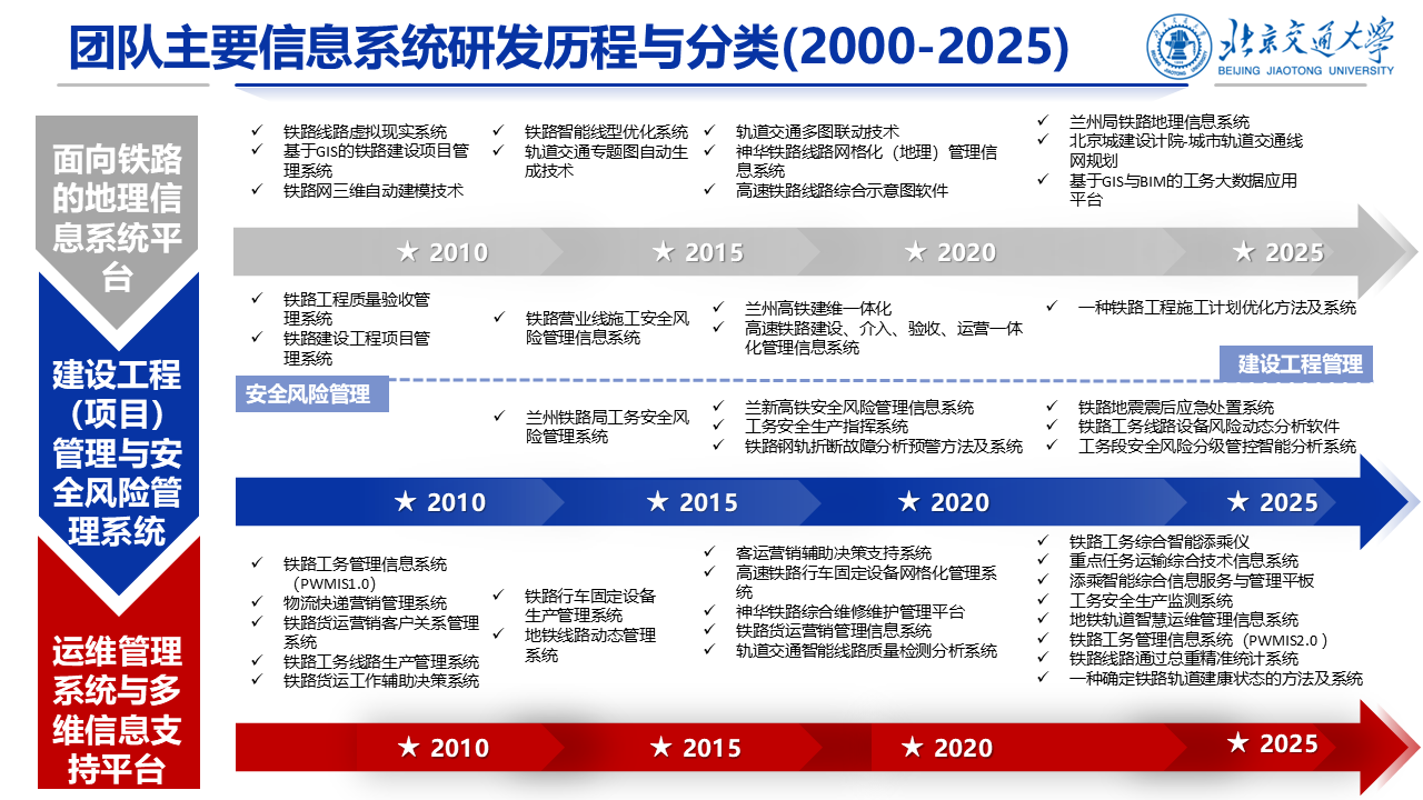 自团队刘仍奎教授于上世纪90年代起将GIS平台首次引入我国铁路系统以来,团队相关研究持续深入开展,有效推动铁路空间信息资源的标准化建设与工程应用。依托全路范围内最完整且逐年更新的铁路地理信息数据库,长期深耕相关平台研发与工程实践,积累了丰富的项目经验与技术成果。铁路工务管理信息系统、安全生产管理系统、铁路地震震后应急处置系统等多项成果实现国铁集团-路局-站段三级全路推广或国铁集团中心部署及应用。