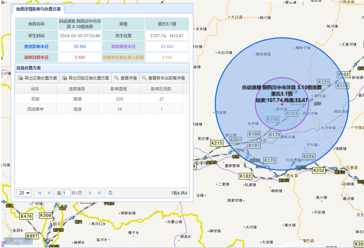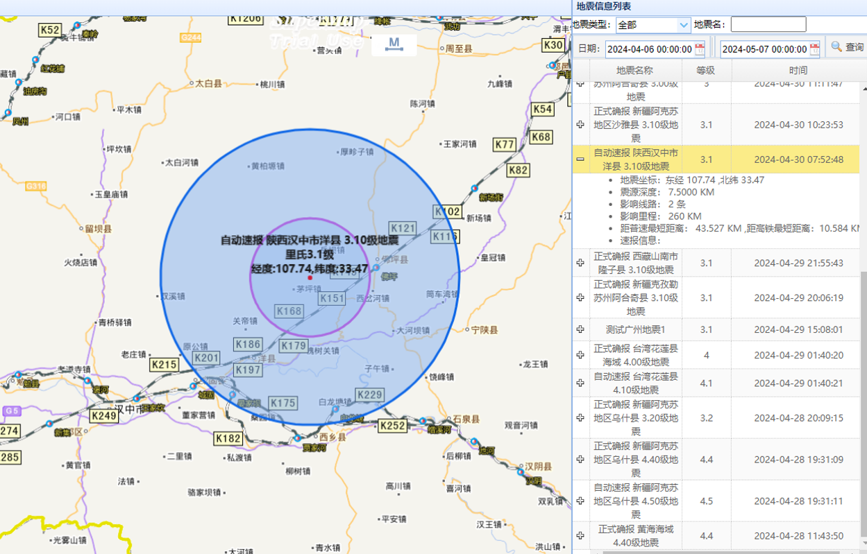 研发“铁路地震震后应急处置系统”,接收“铁路大数据与人工智能平台”接入的“国家地震台网数据交换平台(铁路)”地震速(确)报信息,建立地形特征数据库,调用铁路工务管理信息系统基础线路、车站信息以及铁路地理信息平台基础地图服务,实现自动计算地震影响范围区段详情(地震基本信息、影响线路、影响里程、线路设备情况、地震中心距铁路最短距离等)与自动生成地震应急处置方案措施。该系统已实现在国铁集团主数据中心集中部署,并在应急处置事件中发挥重要作用。