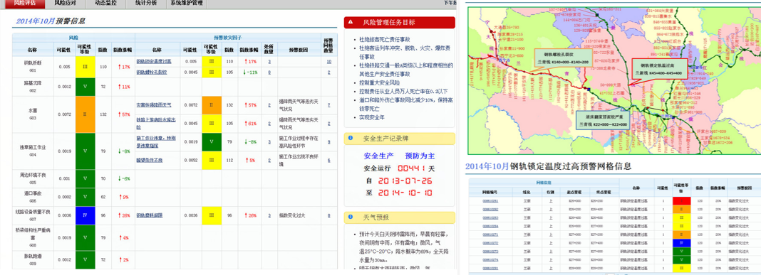 研究风险精准定位分析、风险演变趋势及量化评定、精细化风险应对措施等理论方法及技术,提出安全风险分级管控智能分析系统建设方案并进行系统研发。研究网格化分析方法和时空分布模型,基于既有生产数据,识别风险事件致灾因子、量化评估风险、展示风险时空分布特征,形成风险管理知识库,提供风险评估、风险应对、动态监控、统计分析、系统维护等多功能模块,为运营安全决策提供支持。