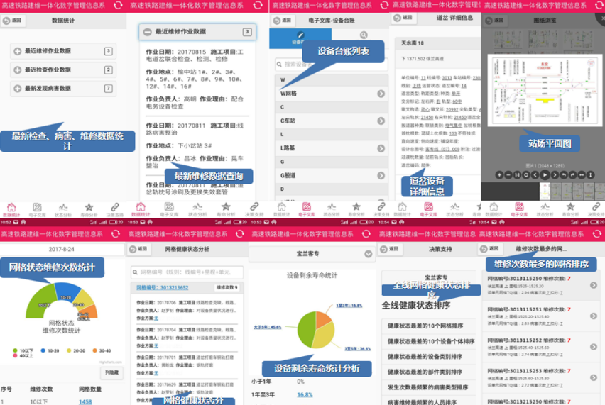 高速铁路建维一体数字化管理信息系统,构建铁路全生命周期电子文库,实现对设备状态精细化评定、规律分析和风险量化,通过网格化管理方法预测维修周期和剩余寿命,为高速铁路安全运营提供决策支持。工务安全生产指挥系统,自动上传轨检车等原始数据生成病害库并评价网格单元,辅助制定作业计划;作业全程由指挥中心通过工务通APP盯控,确保上道有工单、作业留影像、异常能预警,作业后销号更新台账,关联数据并对比维修质量。辅助加强工单管理,在计划层面控制作业范围、作业人员、机具材料、安全隐患、预控措施、主要工作量等。铁路综合维修维护管理平台,通过大数据技术整合机械设备管理、生产管理、作业过程控制、决策支持和机械化维护档案五大子系统,实现铁路资源全生命周期的智能化管理和维护效益最大化。