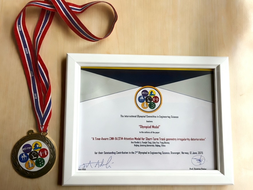 1. The 2nd Olympiad in Engineering Science, “Olympiad Medal”, A Time-Aware CNN-BiLSTM-Attention Model for Short-Term Track Geometry Irregularity Deterioration, 2025. (OES会议每两年举办一次,OES 2025收到来自世界各地近200篇高质量投稿,"Olympiad Medal"奖项授予前5名)