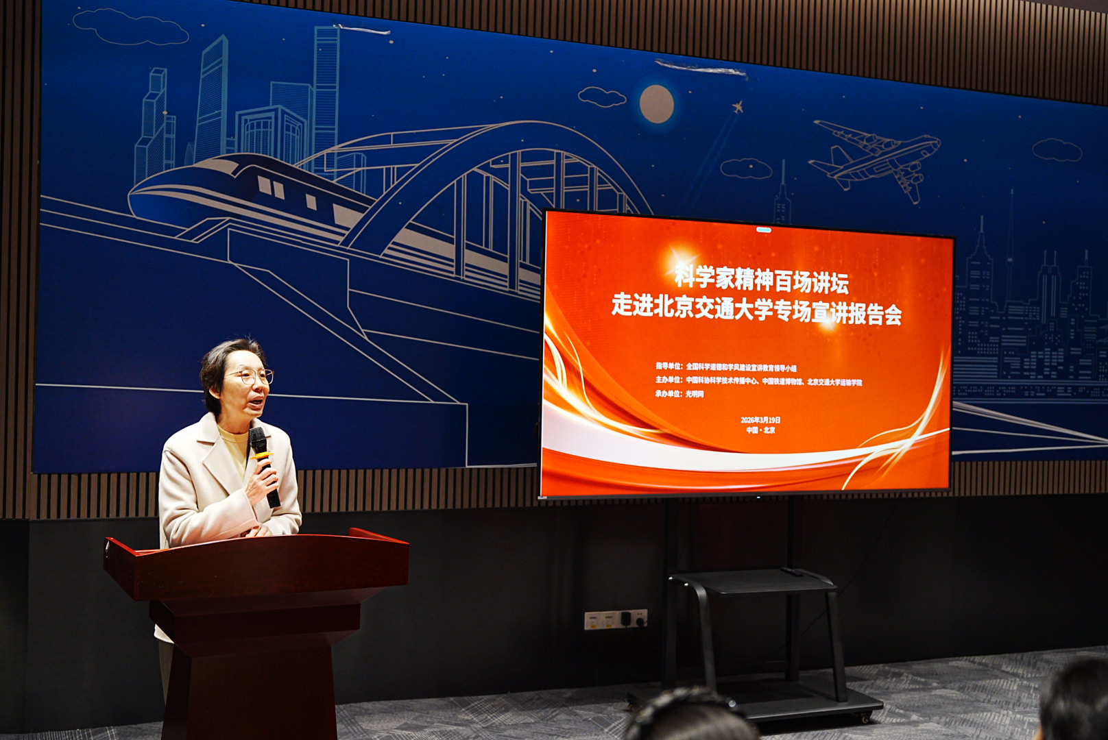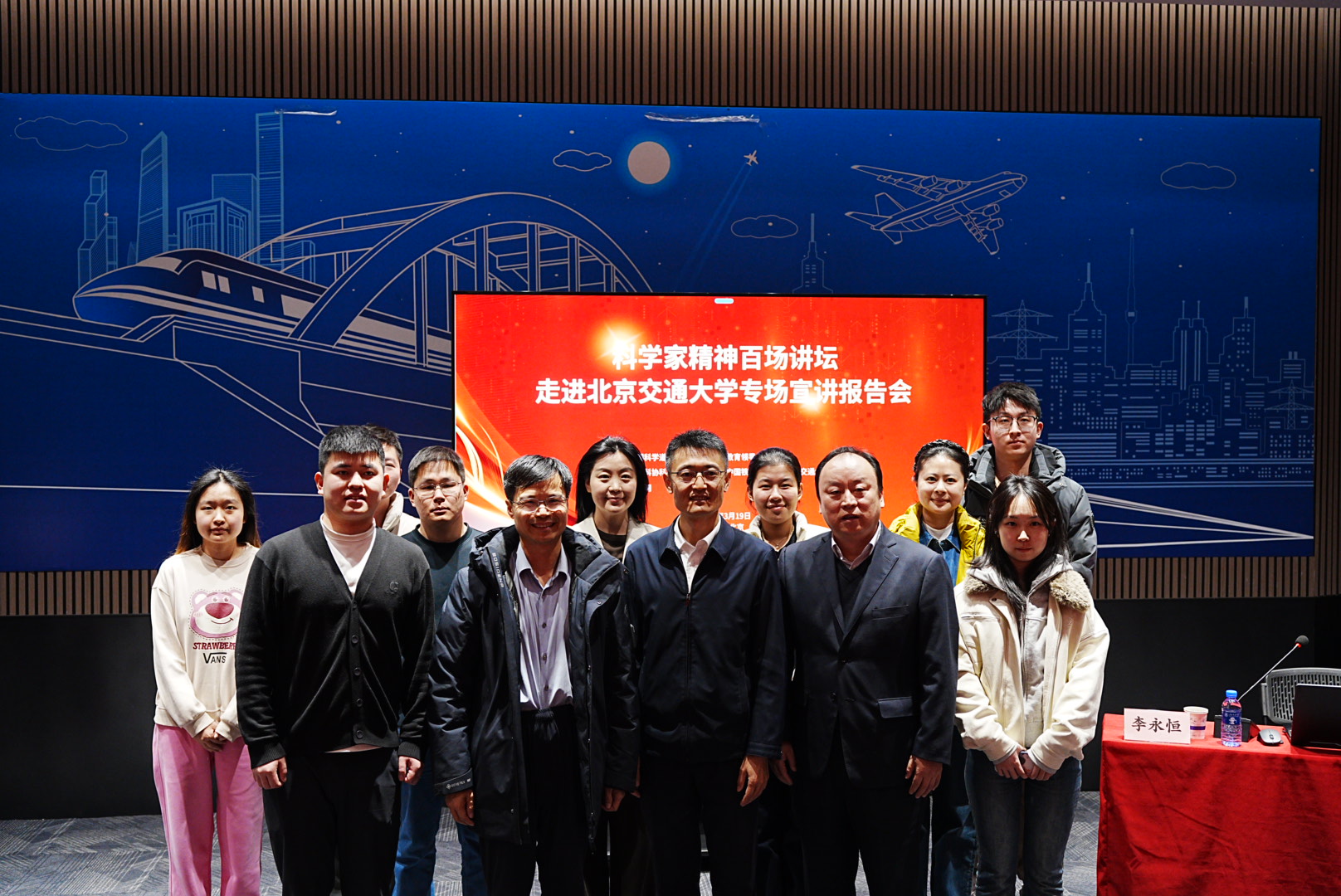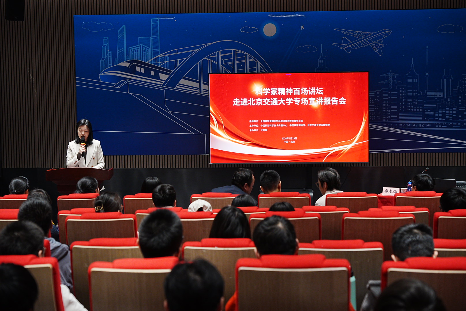 2026年3月19日,“科学家精神百场讲坛”走进304永利集团官网专场宣讲报告会在交通运输科学馆成功举办。“科学家精神百场讲坛”是由全国科学道德和学风建设宣讲教育领导小组指导的全国性品牌活动,本次进校园专场活动由中国科协、中国铁道博物馆、304永利集团联合主办,由光明网承办。本次讲座也是公司迎校庆、开办“运输大讲堂”系列讲座活动之一。国铁集团科技和信息化部装备技术处处长李永恒,中国铁道博物馆副馆长傅梅胜,304永利集团官网公司党委书记孙冬梅,304永利集团官网研究生工作部副部长王萌,304永利集团官网公司党委副书记、副经理陈军华出席活动。本次讲座由中国铁道博物馆社教部副主任杜媛主持。