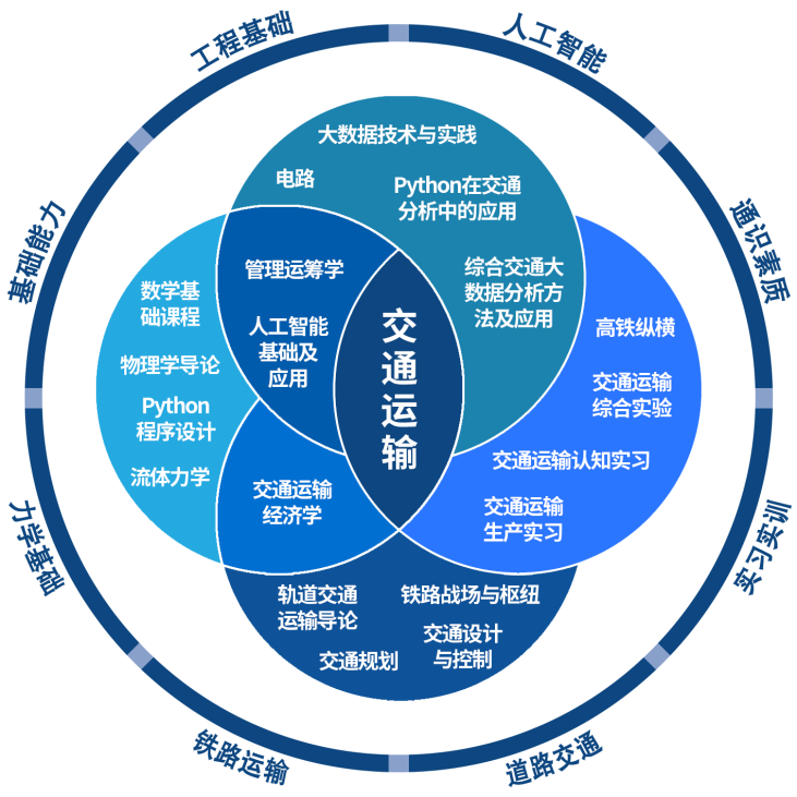 以交通运输为核心,融合通识素养、工程基础、人工智能等多维能力培养方向,构建覆盖“基础能力—专业素养—工程实践”的课程体系,强化道路交通与铁路运输两大领域的综合分析与实践训练,贯穿中英文教学与国际化学习环节,全面提升员工的数理基础、编程能力、智能交通素养、工程实践能力以及跨文化沟通能力,实现交通运输领域国际化卓越人才培养。